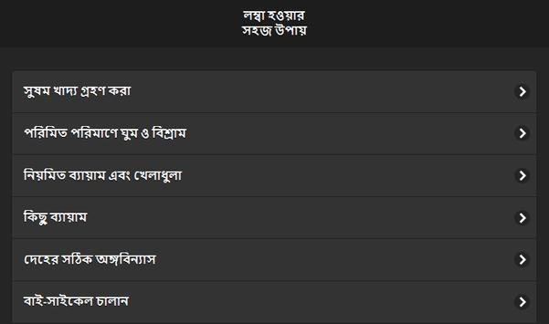 যারা তাদের উচ্চতা নিয়ে চিন্তিত কিংবা আরেকটু লম্বা হতে চান তাদের জন্য এই লম্বা হবার উপায় নিয়ে এপ। লম্বা হওয়ার উপায় গুলো সাজিয়ে এই এপটি তৈরি করা হয়েছে। এপটিতে রয়েছে কিভাবে প্রাকৃতিকভাবে খাদ্য নিয়ন্ত্রন ও ব্যায়ামের মাধ্যমে লম্বা হওয়া যায়। লম্বা হবার সহজ উপায় এপটি সাজানো হয়েছে চ্যাপ্টার বেইজ করে যেন ব্যবহারকারীদের জন্য সহজ হয়। লম্বা হবার উপায় এপটি অফলাইনে কাজ করে।