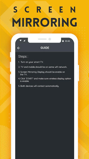 prerequisite - Screen mirroring work properly smart tv should support Wireless Display and TV must be connected to wifi network same as your device connected. Screen Mirroring App to mirror any mobile screen to smart tv connected with same wifi.