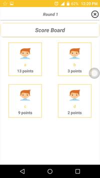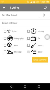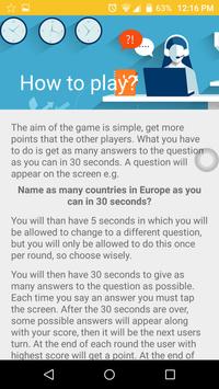 Name as many countries in Europe as you can in 30 seconds? You will than have 5 seconds in which you will be allowed to change to a different question, but you will only be allowed to do this once per round, so choose wisely. You will then have 30 seconds to give as many answers to the question as possible. Each time you say an answer you must tap the screen. After the 30 seconds are over, some possible answers will appear along with your score, then it will be the next users turn. At the end of each round the user with highest score will get a point. At the end of the game the user with the most points will win.