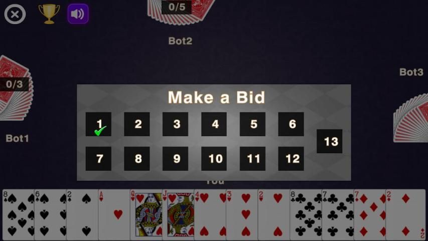 Callbreak Card Game is a relatively long-run game played with 52 cards deck between 4 players with 13 cards each. this games rules are pretty easy to learn.There are 5 rounds in Callbreak Card Game game including 13 trick in one round. For each deal, player must play the same suit card. Spade is default trump card in Callbreak Card Game. The player with highest deals after 5 rounds will be the winner. You can pick your bid, play with competitive opponents, make a correct bid for every deal to show off your skills and trick.