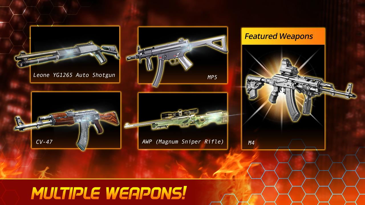 Gun Strike Modern Combat is a totally free game with 6 different maps and more than 40 missions. As playing gun strike blood killer your progress in every mission get difficult and the number of modern combat enemies also increases. Maps could be unlocked when you complete all missions on a single map then you will be able to move on to the next one. Latest weapons such as Tech Armor, M202, AWP, and M1887 could be unlocked when you complete missions and with the new mission, new weapons also come. Use the coins you get to unlock new weapons, or upgrade to strengthen your guns. You can get coins when you shoot terrorists.