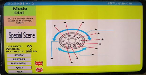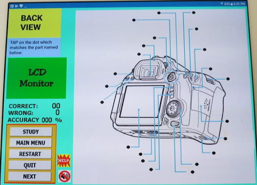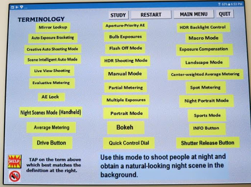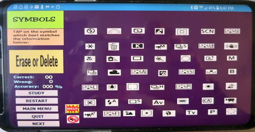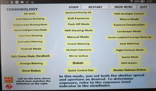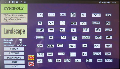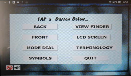 Learning the parts of your camera and the location of buttons and dials is key to a successful photographic experience. This app also helps you to learn 50 of the basic symbols and 30 common terms.