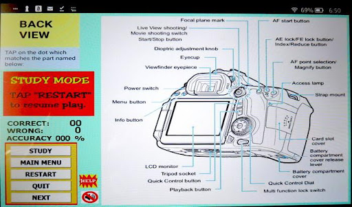The app will let you learn the names and locations of various dials and buttons on your Canon 70D DSLR Camera. The main screens cover the Camera Back, Camera Front, Mode Dial, View Finder, LCD Screen, 50 Symbols and 30 Terms. Each screen has a Study Mode to assist in learning the material.