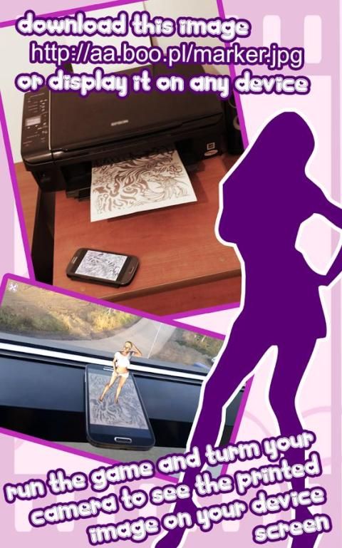Use the special marker image (print, display on phone, display on tablet or any device) and point your phone camera while the game is running in the real mode to see your beautiful girlfriend in reality!
