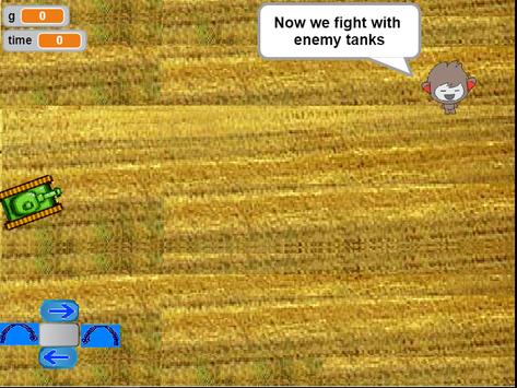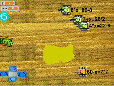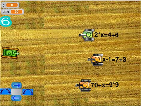 This is a game about one-variable Equations . Sixth grade is where we really start to do actual algebra. This game is created to help students of grade 6 to solve fast equations.In this game the student tries to defend its territory with its' tank against enemy tanks. Every enemy tank has behind it an one-variable equation with unknown x. In the left side of display we see a number that perhaps is a solution for some equations. We have to find the corresponding equations and destroy the tanks. If we destroy the right tank, then we take 1 point for every right tank. If the student destroys the wrong tank then he loses 1 point. If an enemy tank touches your tank, you lose 1 point. Down on the left side of the display you see some buttons with arrows to move, turn right or left the tank and hit. A funny figure (Assistant in game) helps the student with the rules of the game. In the end, according to your performance, you can win 1-5 stars. You earn 1 star (points <0), 2 stars (020). The points appear with indicator g on the left side of display. The game finishes after 5 minutes (300 sec). The time appears on the left side of display. This is a funny game
