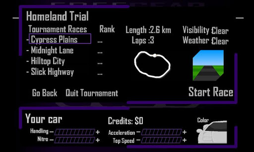 Street racing is a cool retro style 3d racing game . The goal of Street racing is to compete in 5 tournaments against other drivers to win the world championship. As a rookie in the world's largest independent racing tournament, you and directions that will help you getting started!The Game Itself The goal of this game is to place at least third in the five tournaments presented. You can only enter a tournament if you qualified in the previous one. You will win money on each races that you can spend on your car, helping you throughout the game.Use arrow keys to control your racing car. Press "X" to use nitro boost.
