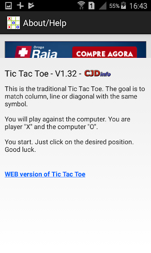 The traditional Tic Tac Toe game. The goal is to match column, line or diagonal with the same symbol. Play against your computer.