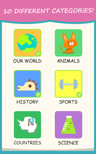 - 10 categories: our world, our body, animals, history, flags, sports, capitals, countries, art and science,