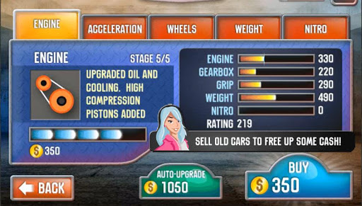 Do you think racing in a straight line is easy? Try to find the right balance between power and grip while staying in your class. Tune your car and accelerate your way to victory, Adding nitrous oxide for more speed booster, but don't hit the button too early! Go deeper and adjust gear ratios to shave off precious milliseconds through 10 levels of cars and race categories.