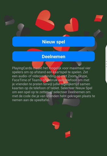 প্লে-কার্ডগুলি একটি স্বজ্ঞাত অ্যাপ্লিকেশন যা রিয়েল-টাইমে একটি দূরত্ব থেকে কার্ডগুলি একসাথে কার্ড খেলতে চারটি খেলোয়াড়কে সক্ষম করে। খেলোয়াড়রা অন্য অ্যাপ্লিকেশন থেকে একটি অডিও বা ভিডিও লিঙ্ক সেট আপ করতে পারে এবং তাদের পছন্দের কার্ড গেমটি খেলতে প্লে-কার্ডগুলি শুরু করতে পারে, এমনকি সামাজিক দূরত্বের সাথে এবং কার্ডগুলির প্রকৃত স্পর্শ ছাড়াই একই রুমে কার্ডগুলিও খেলতে পারে।