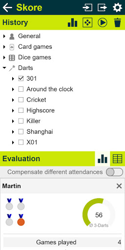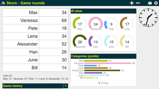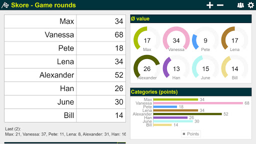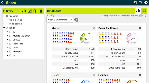 The Skore app is an electronic game block and replaces pencil and paper when playing. Special input aids are available for many card games, dice games and darts games. But also general templates such as a tally list and others are available.