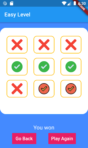The game consists of a square divided into 9 smaller squares. 3 squares in a row and there are 3 columns too. Total they make 9 squares. You play the game by tapping on the square. Once you play, the phone too plays. So basically you are playing against the computer (your phone). Whoever selects a row or column or a diagonal pattern with 3 squares in a line wins the game. There are 3 levels to play - Easy, Intermediate and Hard level. This is a game which you can play and win easily. Feel the joy of winning the game. It's good to get over your sad feelings and stir up the winner in you.