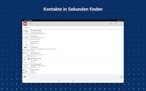 ✓ Schneller den gesuchten Kontakt finden – in dem App-internen Visitenkartenarchiv mit bequeme Such-, Sortierungs - und Gruppierungsfunktionen brauchen Sie nicht mehr lange zu suchen.