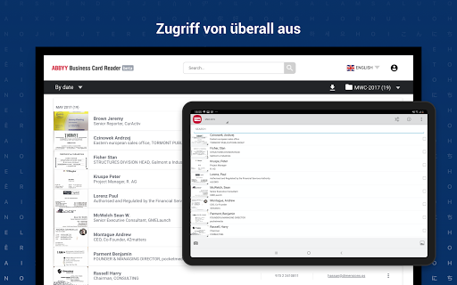 ABBYY Business Card Reader ist eine zeitsparende nützliche Applikation für mühelose Eingabe und Verwaltung Ihrer Kontakte.
