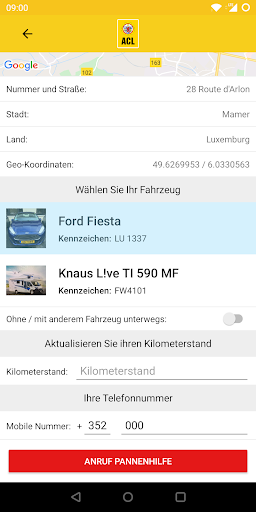 - Für Personen, die noch nicht Mitglied beim ACL sind , erlaubt die Funktion "Mobiler eCall" die Anzeige der Geoposition sowie die Vermittlung des Anrufes an den Pannendienst des Automobilclub’s , ohne jedoch vorab Informationen über die genutzten Fahrzeuge hinterlegen zu können und ohne die automatische und digitale Übermittlung von Standortinformationen.
