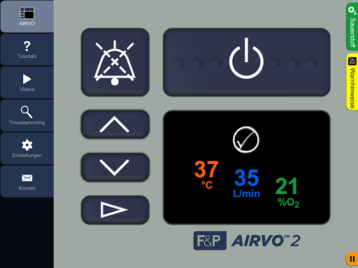 Bitte beachten Sie: Diese Applikation ist eine Demonstration der Airvo2 und myAirvo Benutzeroberflächen für Trainingszwecke und kontrolliert NICHT das Gerät.