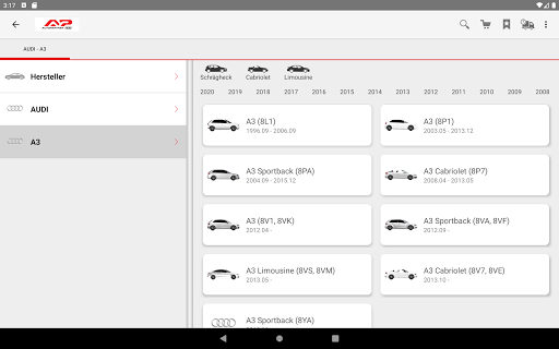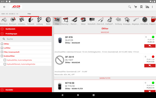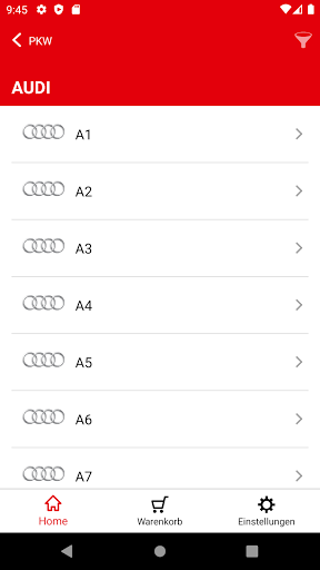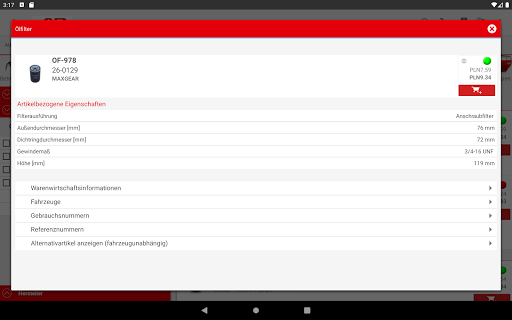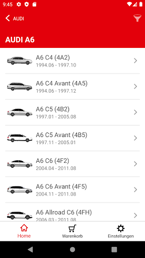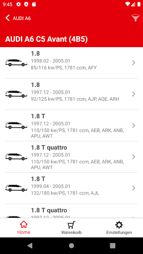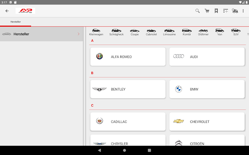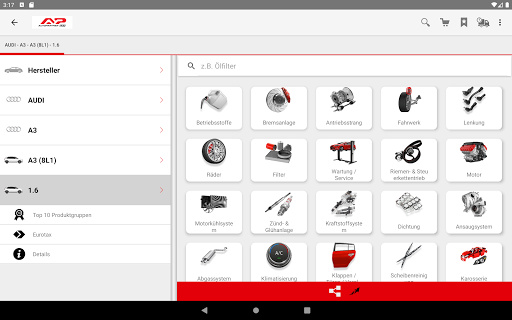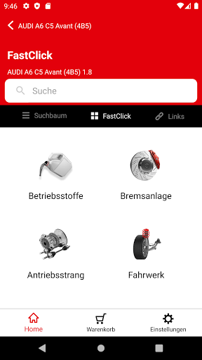 Die App ermöglicht eine schnelle Auswahl von Teilen nach dem TecDoc-Sortimentsbaum und intuitive Fast Click-Symbole, die zu der ausgewählten Sortimentsgruppen weiterleiten.