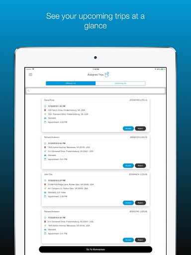 Zunahme die Zuverlässigkeit und Flexibilität Ihres NEMT-Dienstes. Mit aktuellen Informationen über Trips-Zuordnung und operative Updates des zentralen Versandsystems können Sie detaillierte Informationen einschließlich der speziellen Bedürfnisse von Patienten anlegen, alle zu einem Komfort Ihres mobilen Geräts.