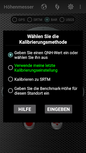 ● Neue Druckhöhenkalibrierungsmethoden (Pro-Version): Kalibrieren Sie den barometrischen Höhenmesser auf den bekannten Referenzhöhenwert oder den SRTM-Referenzhöhenwert. Sie können auch auf zuvor verwendete Kalibrierungswerte zugreifen.