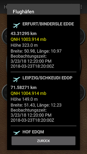 Geräte, die mit einem Barometersensor ausgestattet sind, können auch eine Druckhöhe erhalten, die in eine Höhe über dem Meeresspiegel umgewandelt wird. Um die genauesten Messwerte zu erhalten, kalibrieren Sie die Druckhöhe, indem Sie einen Referenzwert eingeben oder einen Wert aus der dynamischen Liste der nächstgelegenen Flugplätze in der App auswählen. Flugplatzdaten werden normalerweise alle 20 - 30 Minuten aktualisiert.