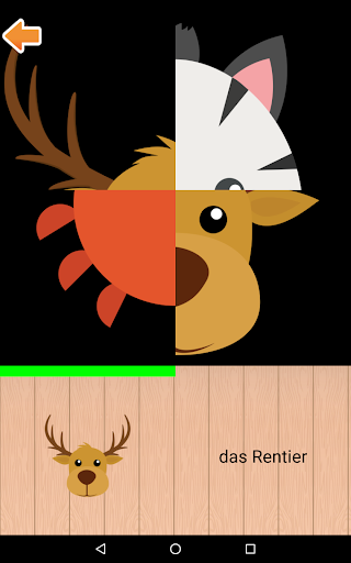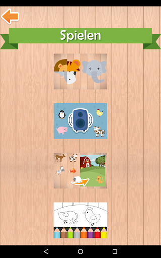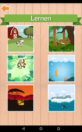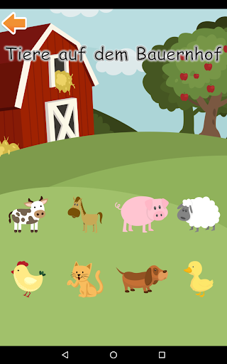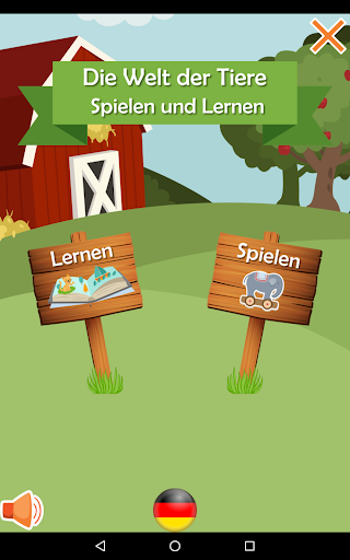 Die Tiere werden mit entsprechenden Bildern, Geräuschen und Beschriftungen in Deutsch dargestellt.