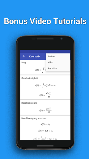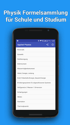 Hier findet Ihr Themen wie Kinematik, Dynamik, Schwingungen, Rotation usw. Physikalische Konstanten und Einheiten sind ebenfalls Teil dieser App. 5 Sprachen werden unterstützt wie Englisch, Deutsch, Französisch, Spanisch und Portugiesisch.