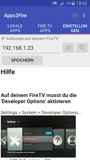Sideloading nutzt die Entwickleroptionen auf dem Fire TV wie es in der Hilfe von Apps2Fire beschrieben ist. Entwickleroptionen sind manchmal unzuverlässig, sei also geduldig damit. Wenn du Probleme hast, versuche die Entwickleroptionen auf dem Fire TV zu deaktivieren und wieder zu aktivieren und starte den Fire TV mehrmals neu.