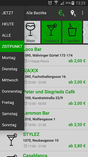 Es kann jetzt ein beliebiger Zeitpunkt als Happy-Hour-Filter gewählt werden (z.b. Samstag um 21:00 Uhr).