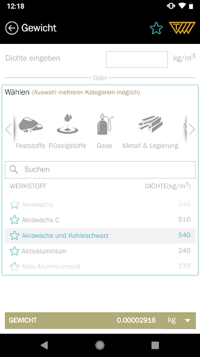 - Fügen Sie bevorzugte Materialien zu Ihren Favoriten hinzu, um das Gewicht schnell zu berechnen.