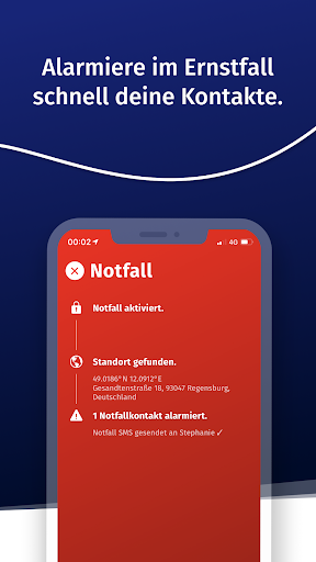 Mit einem Klick auf den Notfallbutton kannst du im Ernstfall schnell deine Notfallkontakte alarmieren. Dabei wird dein Standort bestimmt und automatisch mit deiner Notfallmeldung per SMS verschickt. Wenn du dich gerade aktiv begleiten lässt, dann werden außerdem deine ausgewählten Begleiter per Push-Nachricht über deinen Notfall alarmiert.
