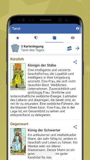 Tarot-Karten können Sie Ihre aktuelle Situation helfen zu erklären und zukünftige Ereignisse zu antizipieren. In dieser App erhalten Sie eine kostenlose Tag Drei-Karten Tarot-Lesung mit detaillierten Interpretationen für jede Karte.