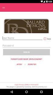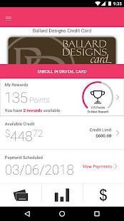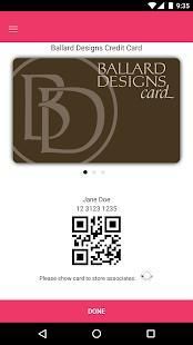 At Ballard Designs, we reward you for your great style. With the new Ballard Designs Card App, you can access your account, check your Reward balance and make payments. Shop online or get directions to your nearest Ballard Designs Store with the tap of a finger.