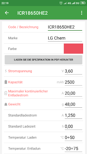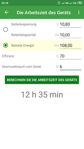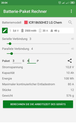 Die Anwendung erleichtert (für Heimwerker und Elektronikfachleute ) die Berechnung der Parameter von Lithium-Ionen-Akkus oder anderen Akkus.