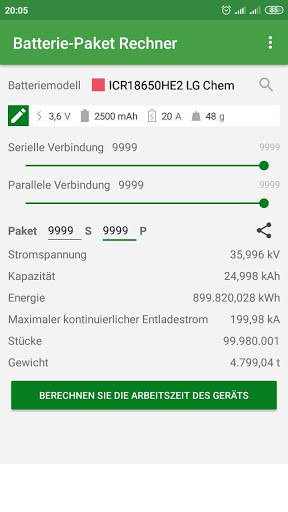 Die Anwendung ermöglicht es Ihnen, Batteriepakete bis 9999S 9999P zu berechnen. fast 100 Millionen Batterien :) Was ermöglicht es Ihnen, Pakete für Elektrofahrräder und solche großen Pakete wie für Elektroautos (EV) zu berechnen.