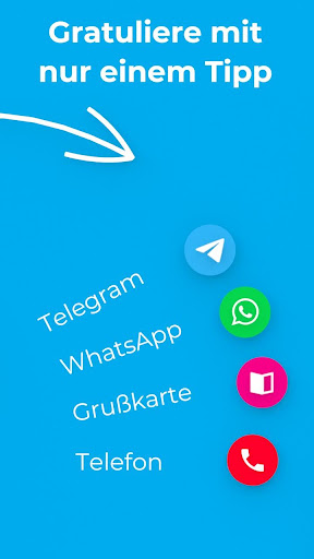 Du wirst zuverlässig an alle wichtigen Geburtstage erinnert, am Tag selbst und auf Wunsch auch einige Tage vorher. So wirst Du an Deine gespeicherten Geschenke erinnert und hast immer ausreichend Zeit noch ein Geschenk zu finden. Mit nur einem Tipp auf die Erinnerung kannst du direkt per WhatsApp,Telegram, Telefon oder SMS gratulieren oder zu deinen Geschenkideen gelangen.