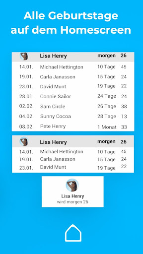 Mithilfe der Widgets dieser Geburtstags App auf deinem Startbildschirm hast Du jeden Geburtstag immer im Blick. Der Birthday Countdown zeigt dir immer sofort die verbleibenden Tage bis zu den nächsten Geburtstagen an. Du hast eine gute Geschenkidee? Ein Tipp auf das Widget und du bist direkt in der App um die Geschenkidee festzuhalten. Ein praktisches Helferlein neben der Erinnerung.