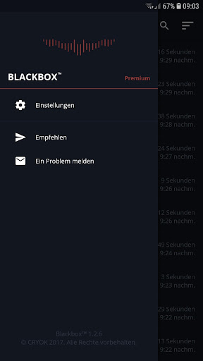 Die Benutzer müssen die Gesetze und Vorschriften zur Anrufaufnahme in ihren jeweiligen Ländern beachten und befolgen, um Verstöße gegen örtliche oder internationale Gesetze zu verhindern. Mit der Nutzung von Blackbox™ akzeptiert der Nutzer die oben genannte Erklärung und akzeptiert, dass der Entwickler keine Verantwortung für Missbrauch oder unsachgemäße Verwendung der Anwendung durch den Nutzer trägt.