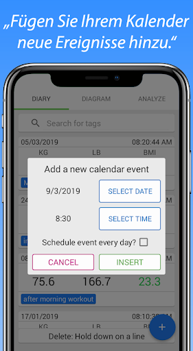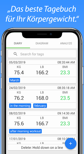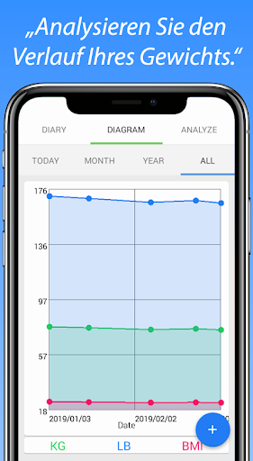 Dieses umfangreiche Körpergewicht Tagebuch bietet Ihnen alle Funktionen, die Sie zum Aufzeichnen, Verfolgen und Analysieren Ihres Körpergewichts benötigen.