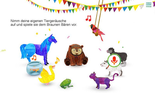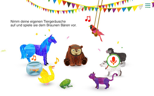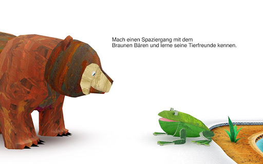 Erkunde mit dem liebenswerten Braunen Bären seine Welt, wo er auf neue Freunde trifft. Lerne den Roten Vogel, die Gelbe Ente, den Grünen Frosch und andere Figuren kennen. Male die Tiere an und vergnüge dich dabei, eigene Geräusche und Musik zu erschaffen. Kinder lieben es, ihre eigene Stimme aufzunehmen, wenn sie singen und eigene Tiergeräusche machen.