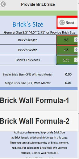 First of all, you should input brick size in first page, namely "Brick Size". Then you can go to wall brick estimation page by pressing "Wall Calculation-1" or "Wall Calculation-2.