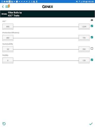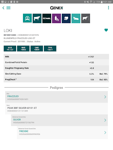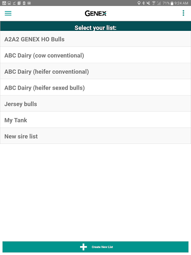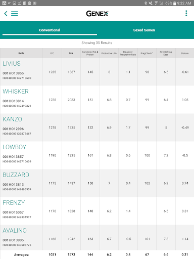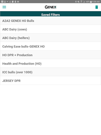 Active Bulls können zu einer Favoritenliste hinzugefügt werden, die von einem wichtigsten genetischen Index oder einzelnen Eigenschaften sortiert oder filtriert werden. Filter und Favoriten können für zukünftige Referenz gespeichert werden. Durch Erstellen eines Benutzerprofils können gespeicherte Favoriten und Filter über Geräte aufgerufen werden.