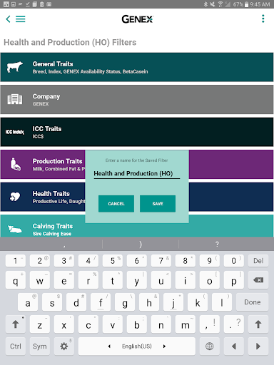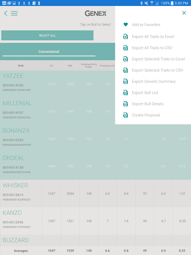 Die App enthält mehrere Dateiexportoptionen. Exportieren Sie eine genetische Zusammenfassung einer Gruppe von Bullen, einer Bullenliste oder einzelne Stierdetails an PDF. Export genetischer Auswertungen für eine Gruppe von Bullen in eine Excel- oder CSV-Datei. Dateien exportieren können auf dem Gerät des Benutzers gespeichert werden, per E-Mail gesendet oder per SMS gesendet werden.