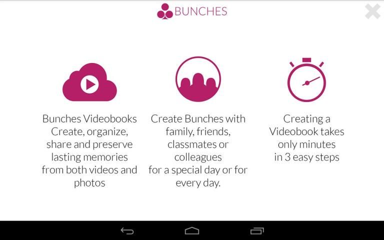 The Bunches app provides a simple way to create, organize, share and preserve both videos and photos transforming them in into highly contextual visual story telling in just minutes.