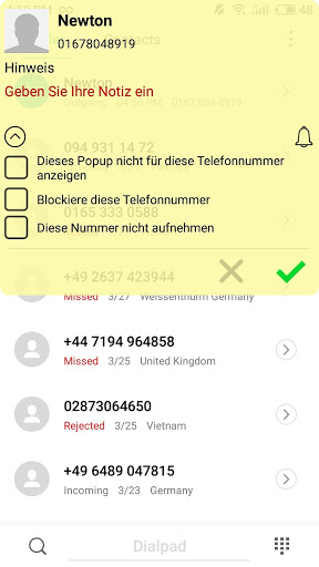 - Erlaube, Telefonnummern aus der Kontakt-App auszuwählen, um sie der Anruf-Blacklist hinzuzufügen. Diese Telefonnummern in der Blacklist werden abgewiesen.