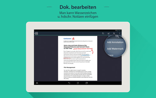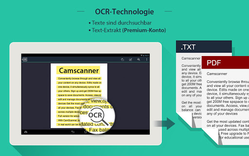 CamScanner HD wandelt Ihren Tablet-Computer in einen mobilen Scanner um. Mit CamScanner sind Sie in der Lage, alle Papierdateien digital zu machen. Schießen Sie einfach ein Foto von z.B. Rechnung, Notiz, Whiteboard-Diskussion oder Vertrag, CamScanner wird automatisch das Foto zuschneiden, verschönen und Industrie-Standard PDF dazu erzeugen. Danach können Sie die Dateien via Email teilen, via Google AirPrint ausdrucken, in Dropbox, Google Docs oder Box.net hochladen, mit Gruppen verwalten oder in CamScanner durchsuchen.