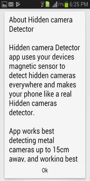 The hidden camera detector application uses your devices magnetic sensor to detect hidden cameras everywhere and makes your phone like real hidden cameras to detect.