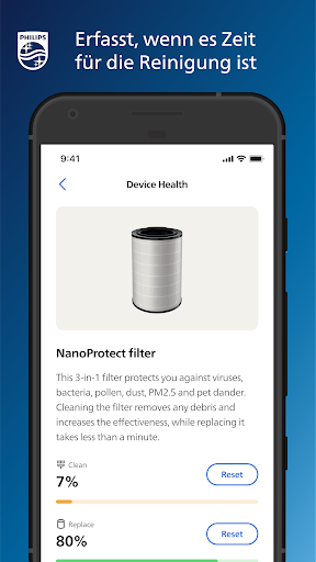 Air verfolgt, wann es an der Zeit ist, bestimmte Teile Ihres Air Geräts zu reinigen oder zu ersetzen, um sicherzustellen, dass es mit maximaler Leistung betrieben wird. Meldungen und Benachrichtigungen weisen Sie darauf hin, wenn die Wartung mit geringem Aufwand durchgeführt werden muss, und Air bietet Schritt-für-Schritt-Anleitungen, falls Sie sie benötigen. Außerdem können Sie in den meisten Fällen neue Filter direkt über die App kaufen.