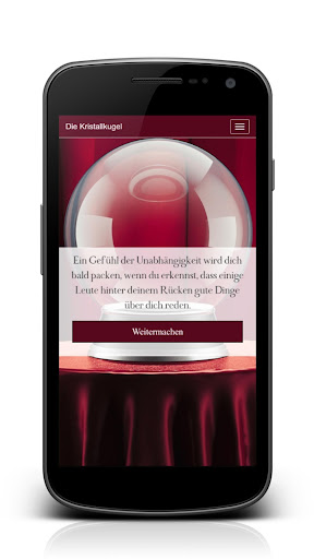 Was wäre, wenn dein Handy dir deine Zukunft geben könnte? Mit dieser Kristallkugel ist das möglich. Durch die Installation dieser Anwendung erhalten Sie viele Informationen über Ihre Zukunft. Es dauert nur wenige Sekunden, bis diese Kristallkugel Ihnen genaue Informationen über die kommenden Abenteuer Ihres Lebens liefert. Liebe, Geld, Glück und Unglück kommen, deine Zukunft wird keine Geheimnisse mehr für sie haben. Es ist kostenlos und sie wird dich nicht nach privaten Informationen fragen!