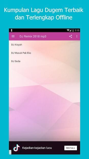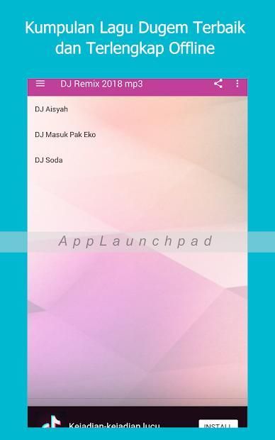 pengguna bisa mendownload dj remix terbaru 2018. didalam aplikasi ini terdapat kumpulan lagu Dj remix terbaru Indonesia maupun mancanegara. pengguna dapat menikmati seluruh lagu-lagu Dj remix didalamnya tanpa sambungan internet (offline) sehingga bisa menghemat penggunaan data internet.