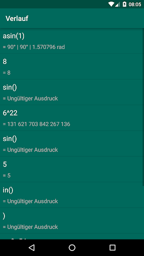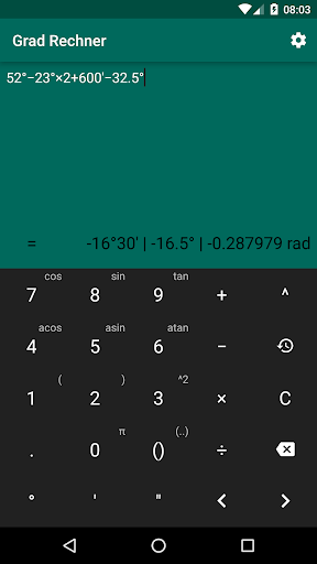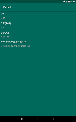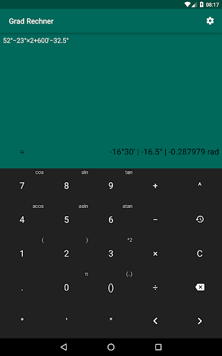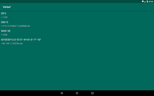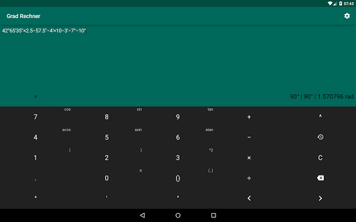 Diese App ermöglicht dir algebraische und trigonometrische Verknüpfung mit Grad, Minuten, Sekunden, Zahlen Radianten einfach durchzuführen. Außerdem hat es andere Fähigkeiten: zeigt den Verlauf der Rechnungen, Verhindern vom Schlafen legen, Vibration beim Tippen.